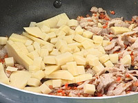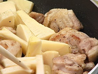 2.たけのこ(下部分の7=8mm角に切ったもの)を入れて炒める。 |