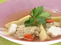 4.はんぺん、人参と(1)のたけのこの穂先部分を加え、ひと煮立ちさせ、器に盛りみつばをかける。 |