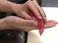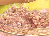 2.ひき肉と(1)のたけのこの下部分、玉ねぎ、しょうが(どちらももみじん切り)を混ぜ合わせ、