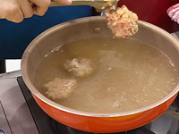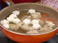 3.鍋にだしを沸かし、薄口醤油、みりんを入れスプーンで(2)のタネを鍋に落とすように入れる。