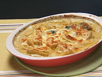 4.炒めた具材と(3)のグラタンソースを混ぜて、グラタン皿にもり、とろけるチーズをかけてオーブンで焼く。(200℃で10〜15分) |