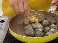 1.あさり(殻付き)をフライパンで蓋をして蒸し煮する。(蒸す時に白ワインをかける) |