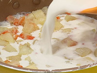 2.バターと油で玉ねぎ・人参・じゃがいも(すべて1cm角にする)・薄力粉を入れて炒め、牛乳・水・コンソメを加える。 |