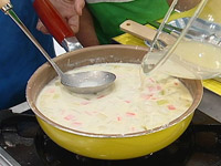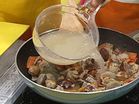 3.(1)で出たあさりの蒸し汁とあさりの缶汁を加える。