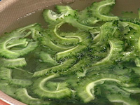 1.ゴーヤは半分に切ってワタをとり、薄くスライスして塩でもんで2、3分置く |