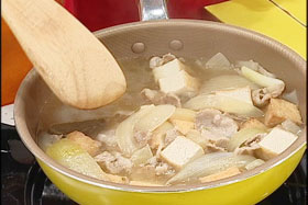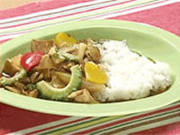 4.(1)のゴーヤを入れて再び5分程煮てお皿にご飯を盛りつける |