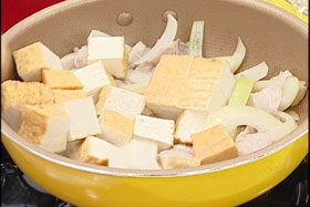 2.豚バラ肉、玉ねぎを炒めしんなりしたら厚揚げを入れてよく炒める。