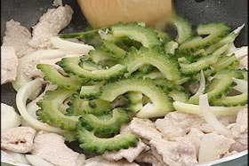 1.生姜、にんにく、豚肉を炒め、色がかわったら、玉ねぎを加え、しんなりしたらゴーヤを入れて炒める |