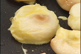 2.溶き卵に玉ふを浸し、指で一押ししながら油をしいたフライパンで焼く。