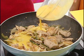 3.玉ふを浸した卵液をフライパンにまわし入れ火を通しながら、