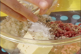 1.合い挽き肉・豆腐・れんこん・玉ねぎ・白ごま・片栗粉・酒・塩・こしょうを混ぜ合わせる
