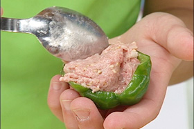 2.ピーマンの内側に片栗粉をぬり(1)をつめる