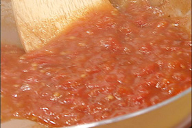 4.肉汁・トマト・ケチャップ・コンソメスープ・砂糖・片栗粉を入れてソースをつくる |
