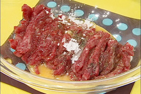 2.塩・こしょうした牛肉に酒・卵・片栗粉・油をいれて混ぜ合わせる |