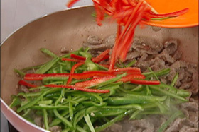 3.牛肉・生姜を炒め、ピーマン・たけのこを入れる