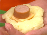2.チェダーチーズとソーセージをじゃがいもの中に入れ、