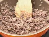 1.玉ねぎ、ひき肉を炒め、塩こしょうで味を調え、トマトソースを入れる