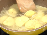1.じゃがいも・玉ねぎをバターで炒め、水・コンソメの素を加えて煮る(約8分)