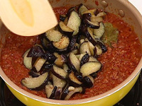 4.なすを油で炒め 塩・こしょうで味を付け、ミートソースと合わせ、パセリを入れる