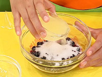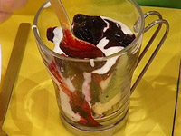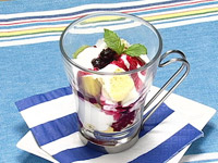 4.カシスソース・生クリームを器に入ったカステラ・黄桃・キウイの上からかける