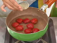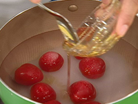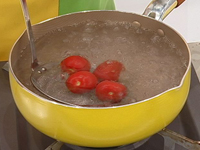 1.ふっとうした湯の中にトマトベリーを入れて取り出し、皮をむく