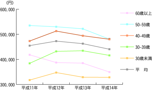 [グラフ:年代別の可処分所得の推移]
