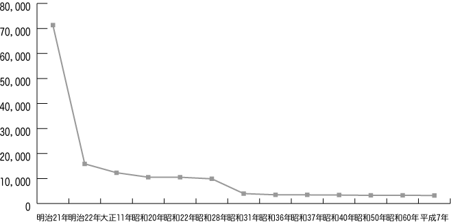 [グラフ:明治21年から平成7年までの市町村の数の推移]