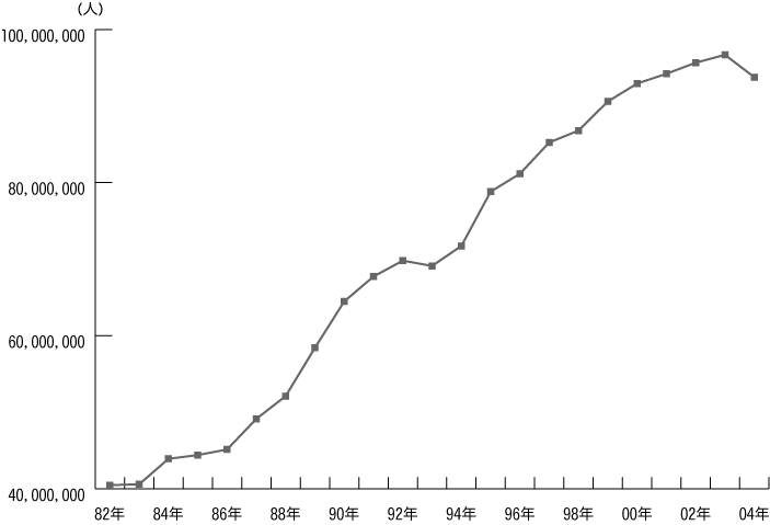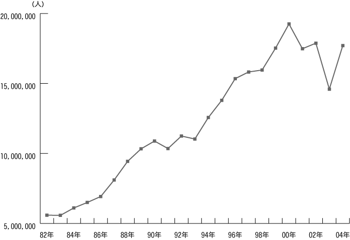 [グラフ:国際航空累年統計(旅客数)]