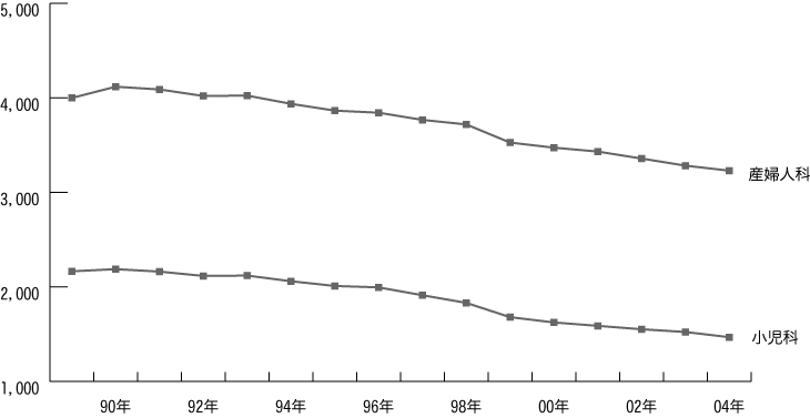 [グラフ:小児科・産婦人科を標榜する一般病院数の推移]
