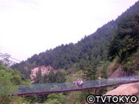 温泉街から寸又峡プロムナードの愛称がある遊歩道を30分歩くと寸又峡のシンボル「夢の吊橋」に。