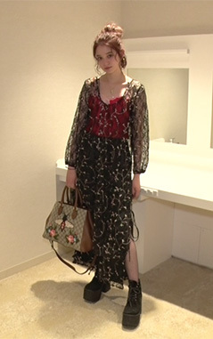 この番組お馴染みの黄色いつなぎもピンクのキャミソールをアクセントに緑の網タイツ、大ぶりのアクセサリーで自己流にアレンジ。