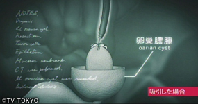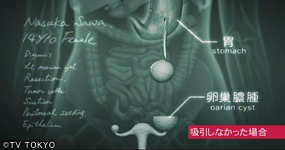 卵巣嚢腫は、卵巣に液状成分が溜まって腫れている状態。他の腫瘍と違い、悪性化することは少ないが、破裂や茎捻転になる可能性もあり、放置するのは危険。摘出手術は、通常難しい手術ではないが、なすかは体に一切傷をつけたくないと主張。そこで命は、「NOTES(ノーツ)」という内視鏡手術を提案する。