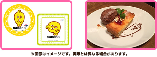 ナナナのイラストが施された、かわいいコラボスウィーツが味わえます。ご注文いただいたお客様には、もれなく、特製ナナナコースターをプレゼント!