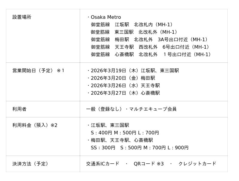 ○株式会社JR東日本スマートロジスティクス(東京都墨田区、代表取締役社長:市原 康史)は、予約・キャッシュレス・多言語対応可能な多機能ロッカー『マルチエキューブ』を大阪市高速電気軌道株式会社(以下、Osaka Metro)沿線の各駅に2026年3月19日より順次設置し、営業を開始してまいります。