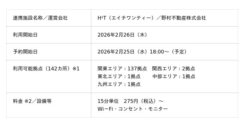 株式会社JR東日本ビルディング(本社:東京都渋谷区、代表取締役社長:西田 直人)が運営するSTATION WORKは、野村不動産株式会社(本社:東京都港区、代表取締役社長:松尾 大作)が展開するサテライト型シェアオフィス「H¹T(エイチワンティー)」142カ所と、2026年2月26日(木)より相互連携を開始します。これにより、STATION WORKが提供する会議室を利用できる拠点は、20カ所から92カ所へと拡大します。