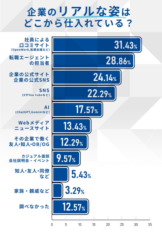 求人票や企業の公式サイトだけでは、職場の雰囲気や残業の実態などはわかりません。ミスマッチを防ぐため、30代はどこから「リアルな情報」を仕入れているのでしょうか。