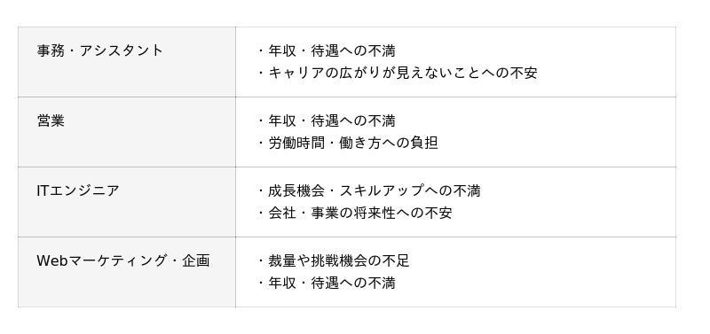 例えば、事務・アシスタント出身の人では、給与水準が上がりにくいことや、専門性を高めづらいことから、「このままでいいのか」と感じて転職を検討するケースが多い傾向にあります。