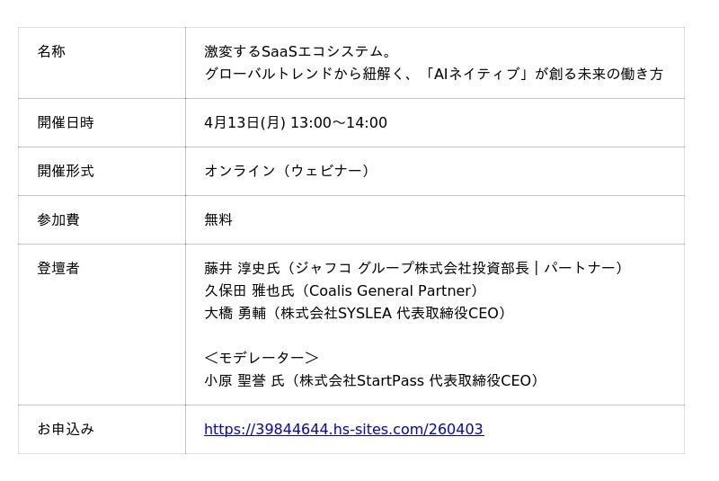 本提携でも目指す「AIネイティブな企業経営」の最前線をお伝えするウェビナーを開催します。「SaaSの死」が囁かれる今、これからの企業経営とソフトウェア選びの基準はどう変わるのか。本ウェビナーでは、米国のスタートアップ動向に詳しい有識者と国内トップVCをゲストにお迎えし、激変するグローバルトレンドを紐解きます。