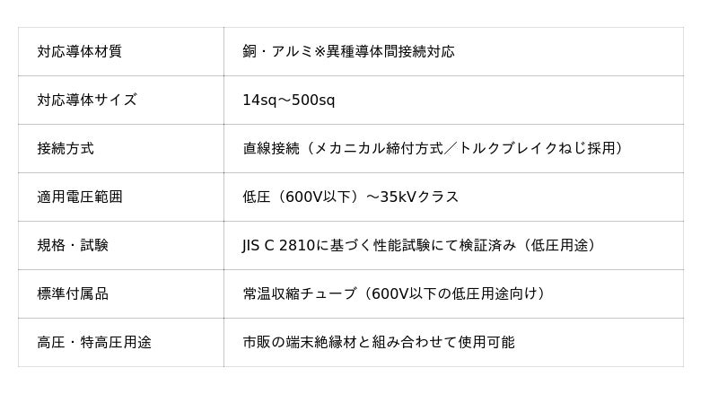 日本のケーブル規格に適合した導体サイズ(14sq~500sq)をカバーし、低圧配線から35kVクラスの高圧用途まで対応可能です。低圧用途においては、JIS C 2810に基づく性能試験(引張強さ・温度上昇・電気抵抗・接続性)にて検証済みです。