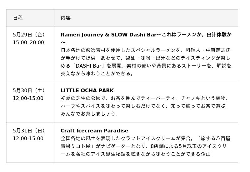 アートやデザイン、トレンドの発信地であり、世界中から多くの人々が集う東京ミッドタウン。芝生広場という開放的な空間に、生産者や各分野のプロフェッショナルによるトークと体験を融合させた「劇場型ワークショップ」エリアが新たに登場します。さらに、今回初展開となる「オフィシャルバー」では、注目の飲食店が日替わりで登場し、特別なテイスティング体験を提供します。各種チケットはオンラインで事前購入いただけます。なお、一部チケットは数量限定での販売となりますので、ぜひお早めにご確認ください。