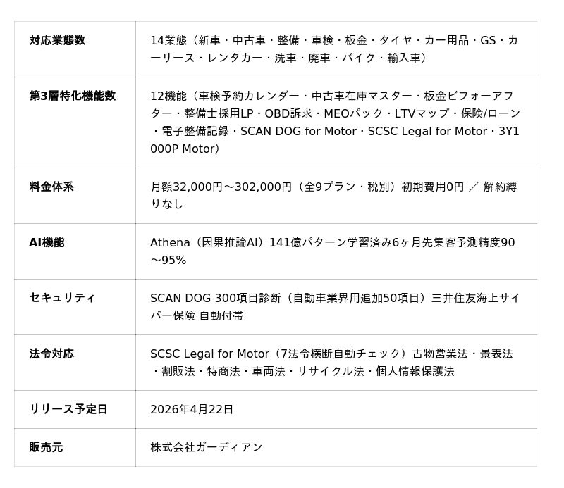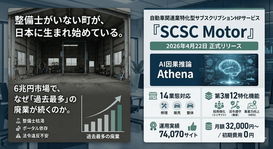 この「見えない詰まり」を解消するために、株式会社ガーディアン(代表取締役:青山裕一)は自動車関連業14業態に特化したWEB戦略サービス「SCSC Motor」を2026年4月22日に正式リリースします。