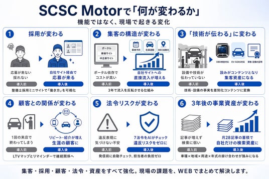 さらに、タイミングがある。OBD検査が2024年10月に本格開始し、電子制御装置整備の新資格制度が2027年1月1日に施行予定。規制変化に対応できた工場だけが、次の10年を生き残ります。SCSC Motorは、その「対応済みの事実」をWEBで集客に変える仕組みです。