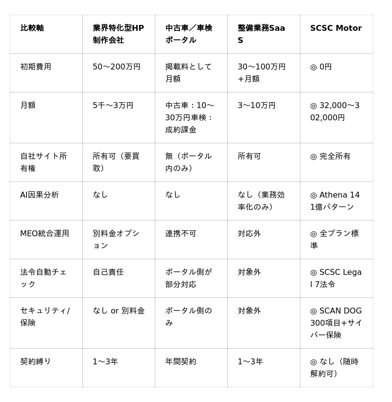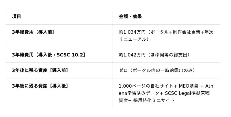 ポータル月額20万円 × 3年 = 720万円。残るのは一時的な露出のみ。SCSC Motorの3年後には、1,000ページの自社サイト・MEO基盤・採用ミニサイトがすべて自社資産として手元に残ります。