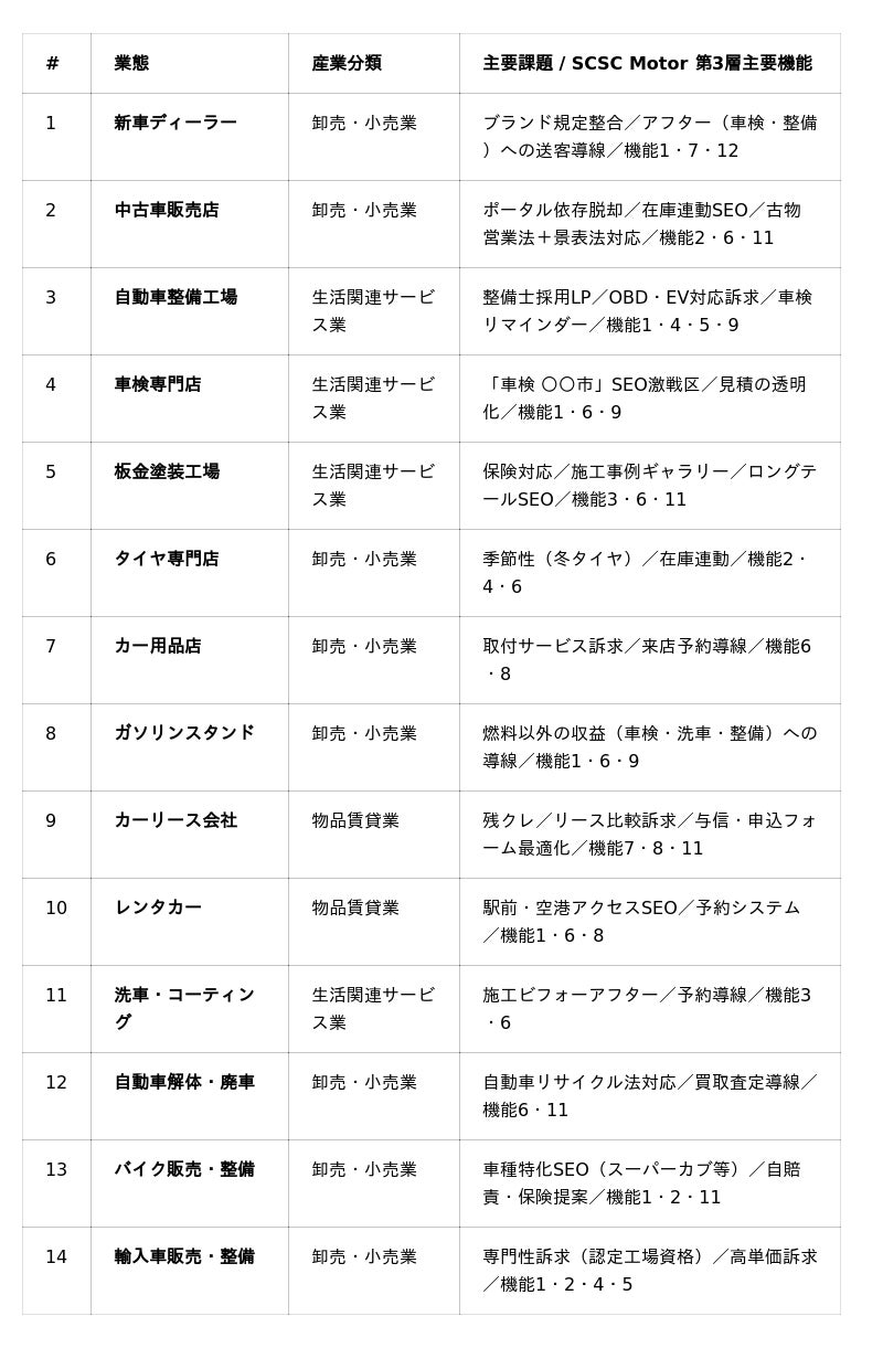 整備・販売・板金・GS・リースなど、14のビジネスモデルそれぞれに固有の課題があります。SCSC Motorは業態別に第3層12機能の最適な組み合わせを提供します。
