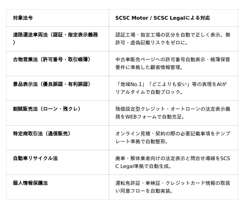 「地域最安値」「どこよりも高く買取」「車検業界No.1」。こうした表現が古物営業法・景表法・道路運送車両法に抵触するケースが後を絶ちません。SCSC Legal for Motorは、発信前に7法令を横断して自動チェック。「知らなかった」を防ぎます。