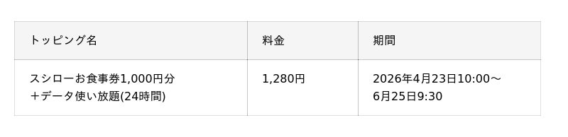KDDI、沖縄セルラー、KDDI Digital Lifeは2026年4月23日から、povo2.0の「コラボトッピング」として、「スシローお食事券1,000円分」と「データ使い放題(24時間)」(注)がセットになったトッピングを1,280円で提供します。データ購入とあわせて、スシローでのお食事もおトクにご利用いただけます。