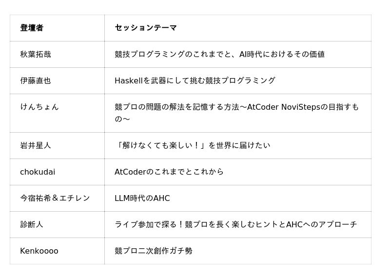 本イベントでは、競技プログラミングの発展に寄与してきた著名な競技者や、競技プログラマーの活躍を支える企業によるトークセッションが実施されました。技術的な知見に加え、キャリアやAI時代における競技プログラミングの価値など、多角的なテーマが語られました。