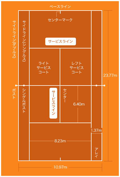 縦23.77m。横8.23m。ラインの幅もコートに含まれる。ダブルスの場合は、横10.97m。