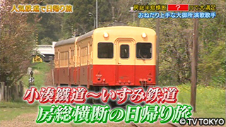 人気のローカル線を乗り継ぎ、歴史を感じる城下町の大多喜では、八代亜紀がレンタルサイクルで町めぐり。さらに、限られた予算の中で、最大の目的である高級食材の伊勢エビを堪能できるか!?