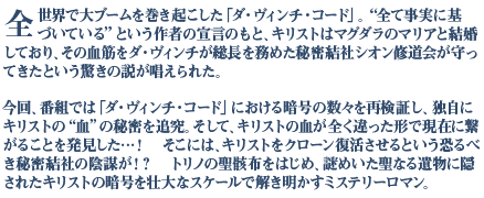 …ほか、「ダ・ヴィンチ・コード」ではマグダラのマリアとされた、「最後の晩餐」に描かれた聖ヨハネを、他の画家による「最後の晩餐」と比較して検証するほか、シオン修道会の正体についても調査を行う。